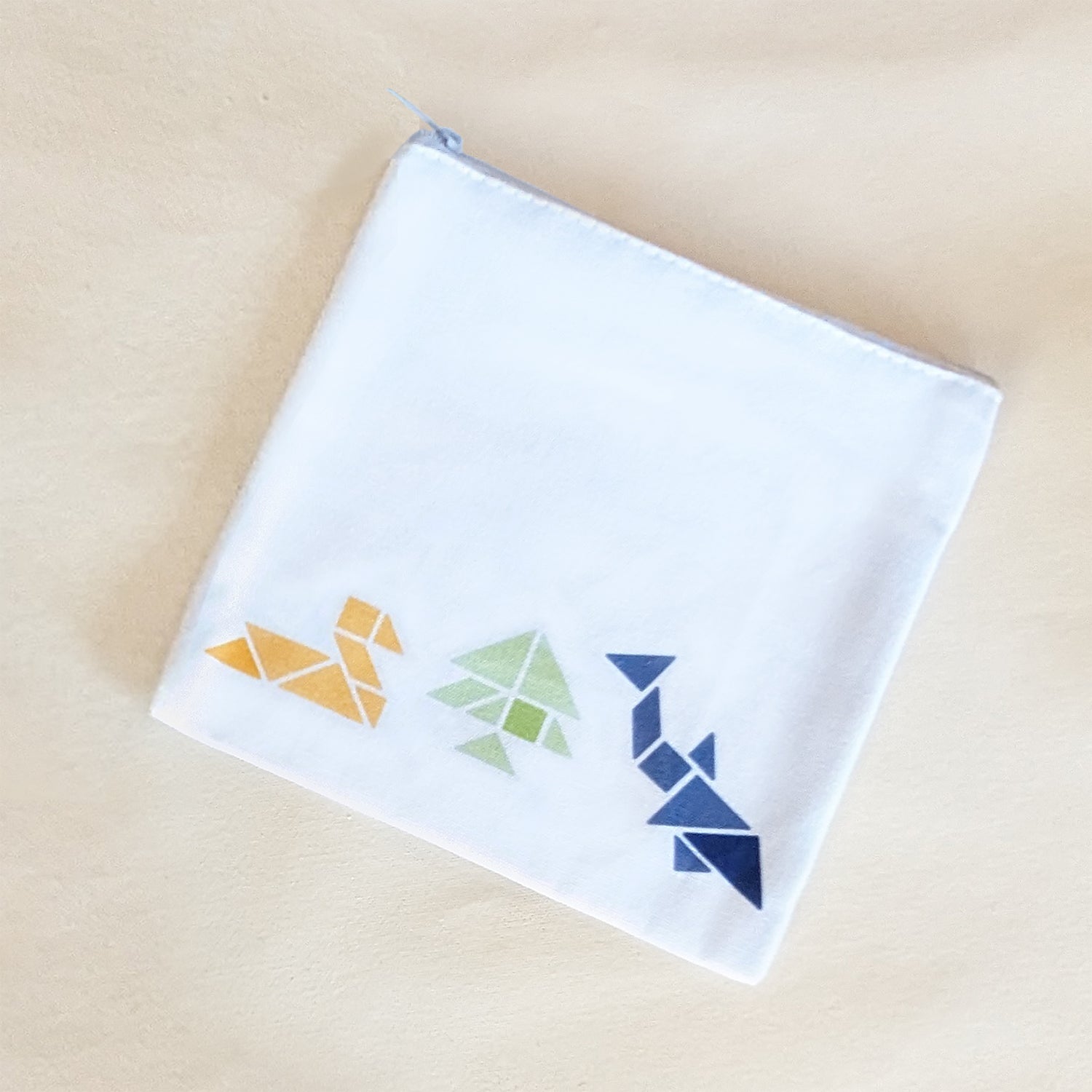 This zipper pouch is an easy way to store and wash your mini tangram pieces. Featuring our cheerful tangram illustrations on both sides, this pouch is a convenient way to take your tangram puzzle on the go!