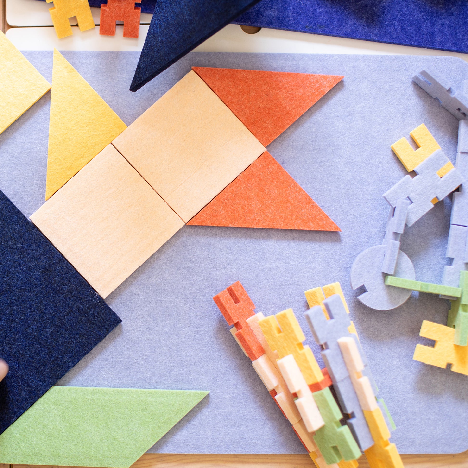 A classic for a reason - these sturdy, floor sized felt blocks are perfect for spatial reasoning puzzling and practice with flexible symbolic representation. One of the oldest versions of a dissection puzzle; a master shape, in this case a square, is dissected into smaller shapes that are then rearranged to create additional puzzles. Simply, and directly demonstrating the mathematical relationship between basic shapes and 45 degree angles, these special shapes flexibly rearrange to illustrate geometric principles of right triangles and ratio concepts of scale and proportion.